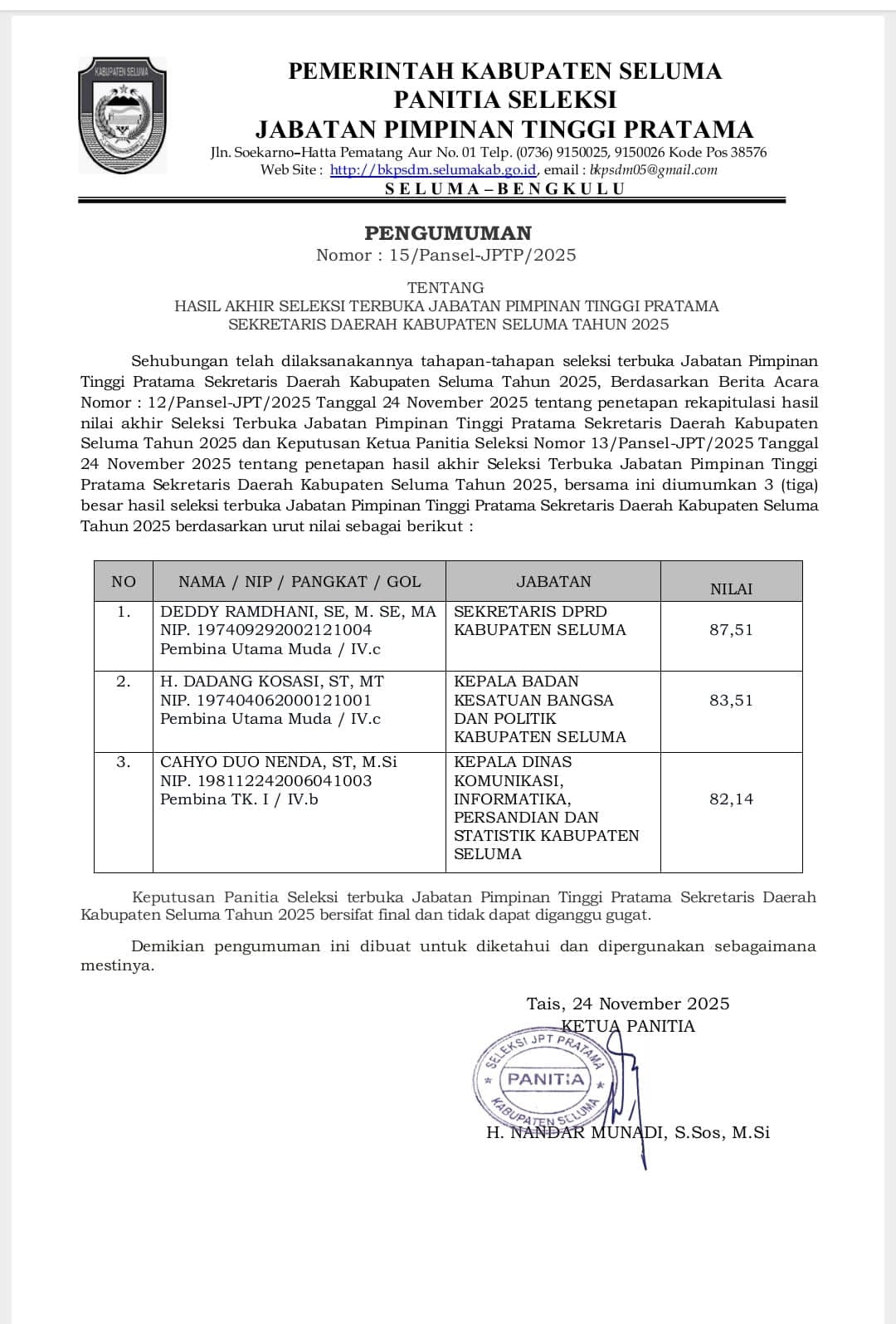 Pengumuman itu tertuang dalam surat pengumuman BKPSDM Kabupaten Seluma No. 15/ Pansel-JPTP/ 2025 tentang Hasil Akhir Seleksi Terbuka Jabatan Pimpinan Tinggi Pratama Sekretaris Daerah Kabupaten Seluma tahun 2025.