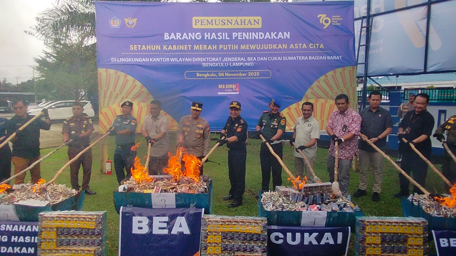 Bengkulu – Direktorat Jenderal Bea dan Cukai Sumatera Barat Bengkulu – Lampung, Kamis (6/11) melakukan pemusnahan barang hasil penindakan setahun kabinet Merah Putih mewujudkan asta cita.