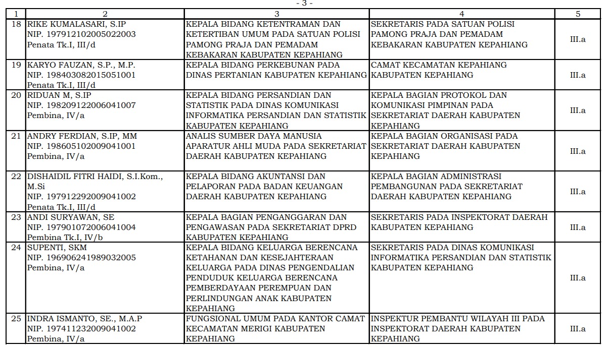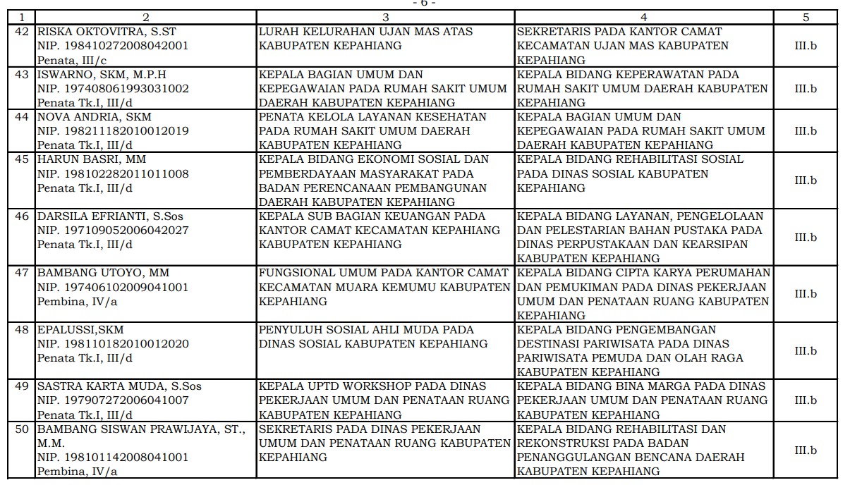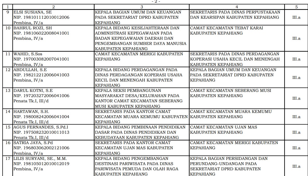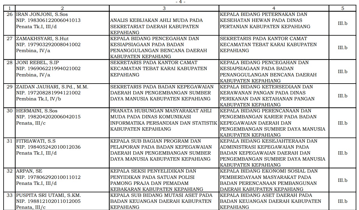 <strong>Kepahiang</strong> - Bupati Kepahiang Zurdi Nata dan Wakil Bupati Abdul Hafizh melakukan mutasi besar-besaran. Total ada 98 pejabat Eselon III dan IV di lingkungan Pemkab Kepahiang terkena mutasi. Jumat (30/01) siang, Bupati dan Wakil Bupati, beserta Sekda langsung menggelar pengambilan sumpah para pejabat Eselon III dan IV. Bupati Kepahiang, Zurdi Nata, mutasi dan rotasi jabatan itu merupakan hal wajar untuk penyegaran organisasi pemerintah daerah. Zurdi mengatakan tidak hanya Pemkab Kepahiang yang melakukan mutasi, hal serupa juga terjadi di Pemkab lainnya di Provinsi Bengkulu. <blockquote>"Setelah meminta izin dan rekomendasi dari badan kepegawaian negara, hari ini kita melantik pejabat Eselon III dan IV," kata Bupati saat pelantikan.</blockquote> Tidak hanya itu, Bupati menegaskan jika penempatan pejabat sesuai dengan ketentuan dan peraturan perundang-undangan yang berlaku. <blockquote>"Mutasi ini diharapkan dapat memaksimalkan kinerja dan mendukung visi dan misi Bupati dan Wakil Bupati Kepahiang," lanjutnya.</blockquote> Dengan adanya rotasi jabatan ini, Zurdi meminta agar para pejabat yang menduduki jabatan baru segera beradaptasi dan memberikan pelayanan terbaik. <blockquote>"Tentunya kita harus memberikan pelayanan terbaik kepada masyarakat, oleh karenanya kita harus segera menyesuaikan diri," tandasnya.</blockquote> <h3>Daftar Nama dan Jabatan Pejabat Eselon III dan IV yang Dimutasi</h3> <img class="alignnone size-full wp-image-11199" src="https://camkohatv.id/wp-content/uploads/2026/01/WhatsApp-Image-2026-01-30-at-15.18.05.jpeg" alt="" width="1237" height="749" /><!--nextpage--> <img class="alignnone size-full wp-image-11200" src="https://camkohatv.id/wp-content/uploads/2026/01/WhatsApp-Image-2026-01-30-at-15.18.05-1.jpeg" alt="" width="1186" height="678" /> <img class="alignnone size-full wp-image-11201" src="https://camkohatv.id/wp-content/uploads/2026/01/WhatsApp-Image-2026-01-30-at-15.18.05-2.jpeg" alt="" width="1201" height="692" /> <img class="alignnone size-full wp-image-11202" src="https://camkohatv.id/wp-content/uploads/2026/01/WhatsApp-Image-2026-01-30-at-15.18.04.jpeg" alt="" width="1198" height="701" /> <img class="alignnone size-full wp-image-11203" src="https://camkohatv.id/wp-content/uploads/2026/01/WhatsApp-Image-2026-01-30-at-15.18.04-1.jpeg" alt="" width="1205" height="732" /> <img class="alignnone size-full wp-image-11204" src="https://camkohatv.id/wp-content/uploads/2026/01/WhatsApp-Image-2026-01-30-at-15.18.04-2.jpeg" alt="" width="1205" height="688" /> <img class="alignnone size-full wp-image-11205" src="https://camkohatv.id/wp-content/uploads/2026/01/WhatsApp-Image-2026-01-30-at-15.18.04-3.jpeg" alt="" width="1205" height="705" /> <img class="alignnone size-full wp-image-11206" src="https://camkohatv.id/wp-content/uploads/2026/01/WhatsApp-Image-2026-01-30-at-15.18.04-4.jpeg" alt="" width="1205" height="713" /> <img class="alignnone size-full wp-image-11207" src="https://camkohatv.id/wp-content/uploads/2026/01/WhatsApp-Image-2026-01-30-at-15.18.03.jpeg" alt="" width="1207" height="666" /> <img class="alignnone size-full wp-image-11208" src="https://camkohatv.id/wp-content/uploads/2026/01/WhatsApp-Image-2026-01-30-at-15.18.03-1.jpeg" alt="" width="1209" height="689" /> <img class="alignnone size-full wp-image-11209" src="https://camkohatv.id/wp-content/uploads/2026/01/WhatsApp-Image-2026-01-30-at-15.18.03-2.jpeg" alt="" width="1209" height="725" /> <img class="alignnone size-full wp-image-11210" src="https://camkohatv.id/wp-content/uploads/2026/01/WhatsApp-Image-2026-01-30-at-15.18.02.jpeg" alt="" width="1201" height="330" />