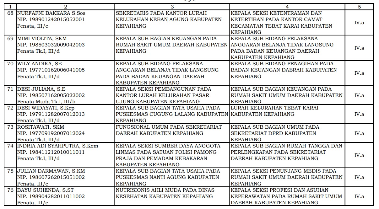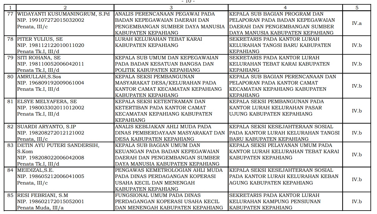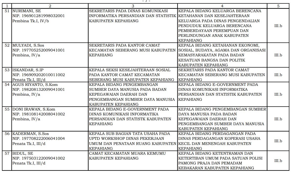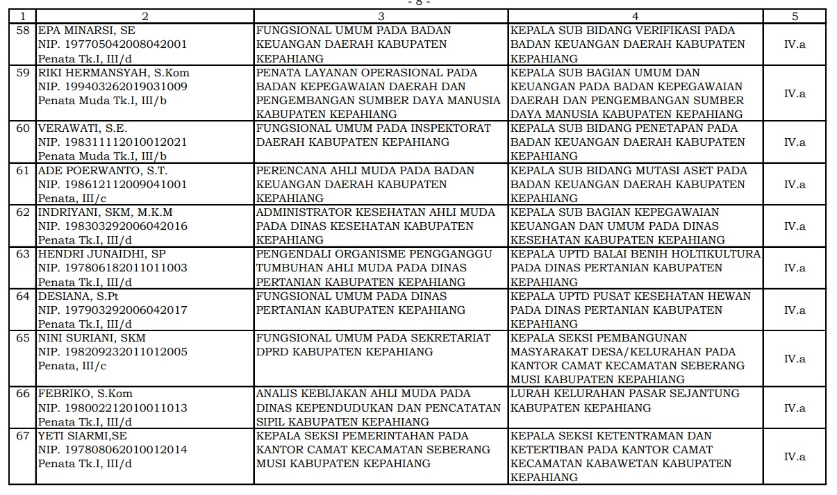 <strong>Kepahiang</strong> - Bupati Kepahiang Zurdi Nata dan Wakil Bupati Abdul Hafizh melakukan mutasi besar-besaran. Total ada 98 pejabat Eselon III dan IV di lingkungan Pemkab Kepahiang terkena mutasi. Jumat (30/01) siang, Bupati dan Wakil Bupati, beserta Sekda langsung menggelar pengambilan sumpah para pejabat Eselon III dan IV. Bupati Kepahiang, Zurdi Nata, mutasi dan rotasi jabatan itu merupakan hal wajar untuk penyegaran organisasi pemerintah daerah. Zurdi mengatakan tidak hanya Pemkab Kepahiang yang melakukan mutasi, hal serupa juga terjadi di Pemkab lainnya di Provinsi Bengkulu. <blockquote>"Setelah meminta izin dan rekomendasi dari badan kepegawaian negara, hari ini kita melantik pejabat Eselon III dan IV," kata Bupati saat pelantikan.</blockquote> Tidak hanya itu, Bupati menegaskan jika penempatan pejabat sesuai dengan ketentuan dan peraturan perundang-undangan yang berlaku. <blockquote>"Mutasi ini diharapkan dapat memaksimalkan kinerja dan mendukung visi dan misi Bupati dan Wakil Bupati Kepahiang," lanjutnya.</blockquote> Dengan adanya rotasi jabatan ini, Zurdi meminta agar para pejabat yang menduduki jabatan baru segera beradaptasi dan memberikan pelayanan terbaik. <blockquote>"Tentunya kita harus memberikan pelayanan terbaik kepada masyarakat, oleh karenanya kita harus segera menyesuaikan diri," tandasnya.</blockquote> <h3>Daftar Nama dan Jabatan Pejabat Eselon III dan IV yang Dimutasi</h3> <img class="alignnone size-full wp-image-11199" src="https://camkohatv.id/wp-content/uploads/2026/01/WhatsApp-Image-2026-01-30-at-15.18.05.jpeg" alt="" width="1237" height="749" /><!--nextpage--> <img class="alignnone size-full wp-image-11200" src="https://camkohatv.id/wp-content/uploads/2026/01/WhatsApp-Image-2026-01-30-at-15.18.05-1.jpeg" alt="" width="1186" height="678" /> <img class="alignnone size-full wp-image-11201" src="https://camkohatv.id/wp-content/uploads/2026/01/WhatsApp-Image-2026-01-30-at-15.18.05-2.jpeg" alt="" width="1201" height="692" /> <img class="alignnone size-full wp-image-11202" src="https://camkohatv.id/wp-content/uploads/2026/01/WhatsApp-Image-2026-01-30-at-15.18.04.jpeg" alt="" width="1198" height="701" /> <img class="alignnone size-full wp-image-11203" src="https://camkohatv.id/wp-content/uploads/2026/01/WhatsApp-Image-2026-01-30-at-15.18.04-1.jpeg" alt="" width="1205" height="732" /> <img class="alignnone size-full wp-image-11204" src="https://camkohatv.id/wp-content/uploads/2026/01/WhatsApp-Image-2026-01-30-at-15.18.04-2.jpeg" alt="" width="1205" height="688" /> <img class="alignnone size-full wp-image-11205" src="https://camkohatv.id/wp-content/uploads/2026/01/WhatsApp-Image-2026-01-30-at-15.18.04-3.jpeg" alt="" width="1205" height="705" /> <img class="alignnone size-full wp-image-11206" src="https://camkohatv.id/wp-content/uploads/2026/01/WhatsApp-Image-2026-01-30-at-15.18.04-4.jpeg" alt="" width="1205" height="713" /> <img class="alignnone size-full wp-image-11207" src="https://camkohatv.id/wp-content/uploads/2026/01/WhatsApp-Image-2026-01-30-at-15.18.03.jpeg" alt="" width="1207" height="666" /> <img class="alignnone size-full wp-image-11208" src="https://camkohatv.id/wp-content/uploads/2026/01/WhatsApp-Image-2026-01-30-at-15.18.03-1.jpeg" alt="" width="1209" height="689" /> <img class="alignnone size-full wp-image-11209" src="https://camkohatv.id/wp-content/uploads/2026/01/WhatsApp-Image-2026-01-30-at-15.18.03-2.jpeg" alt="" width="1209" height="725" /> <img class="alignnone size-full wp-image-11210" src="https://camkohatv.id/wp-content/uploads/2026/01/WhatsApp-Image-2026-01-30-at-15.18.02.jpeg" alt="" width="1201" height="330" />