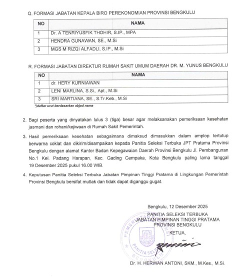 Bengkulu – Setelah melalui serangkaian penilaian, Panitia Seleksi Lelang Jabatan Eselon II Pemprov Bengkulu mengumumkan 3 besar untuk setiap jabatan yang dilelang.