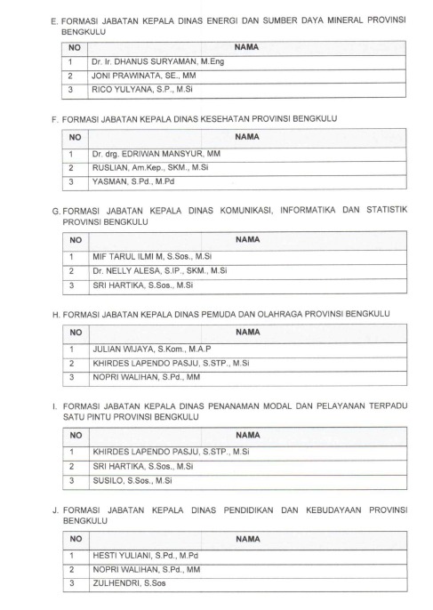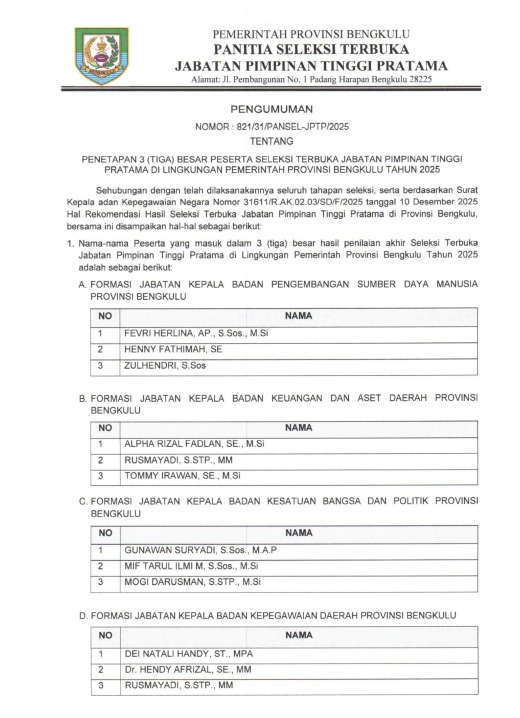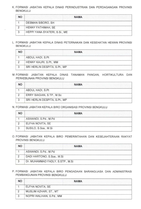 Berikut daftar 3 besar calon 18 kepala OPD Pemprov Bengkulu.