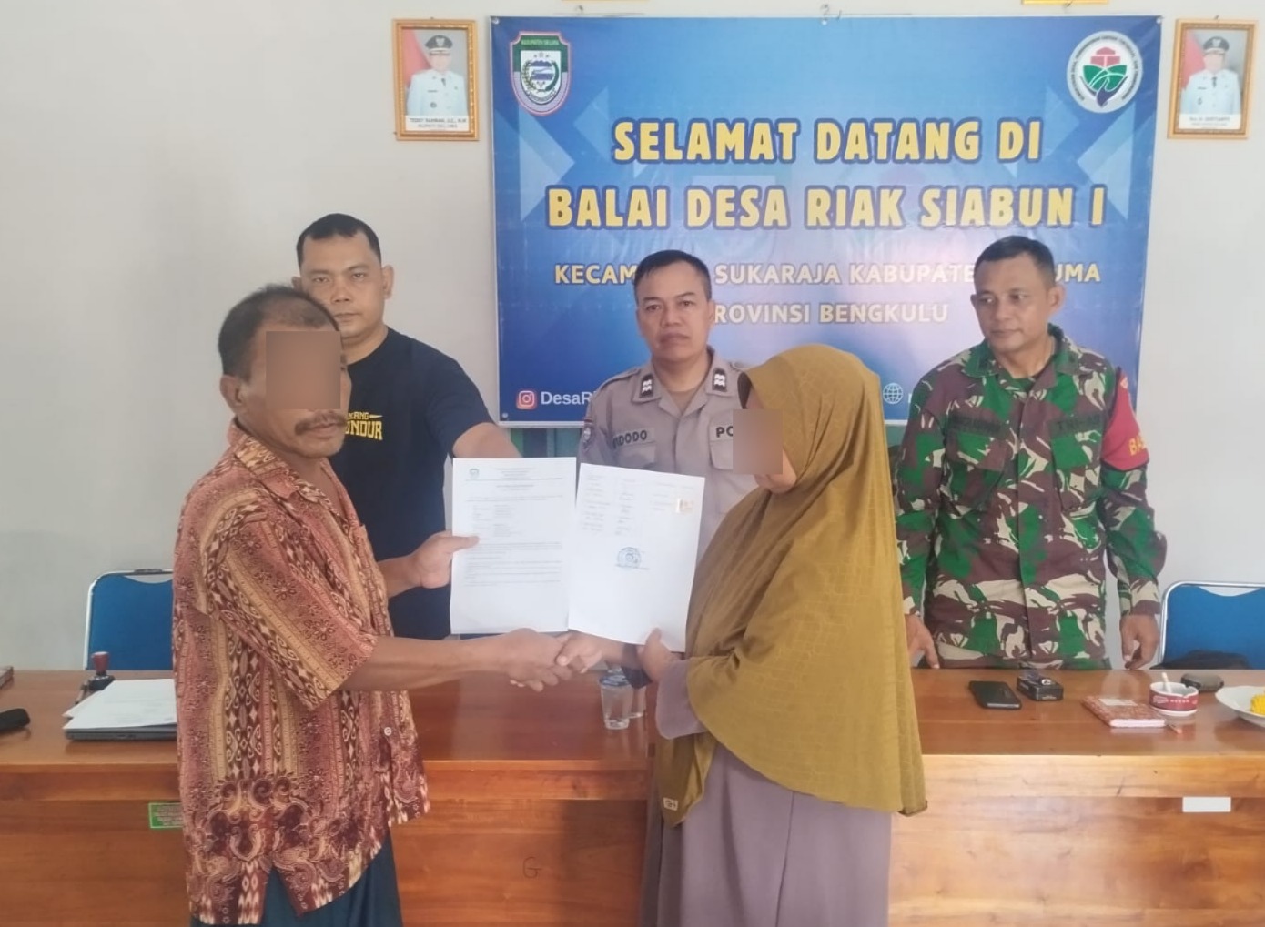 Namun permasalahan ini telah diselesaikan di tingkat desa, setelah Kades Riak Siabun bersama perangkat desa melibatkan sejumlah tokoh masyarakat dan Bhabinkamtibmas serta Babinsa berkumpul di Balai Desa Riak Siabun untuk memanggil kedua belah pihak.
