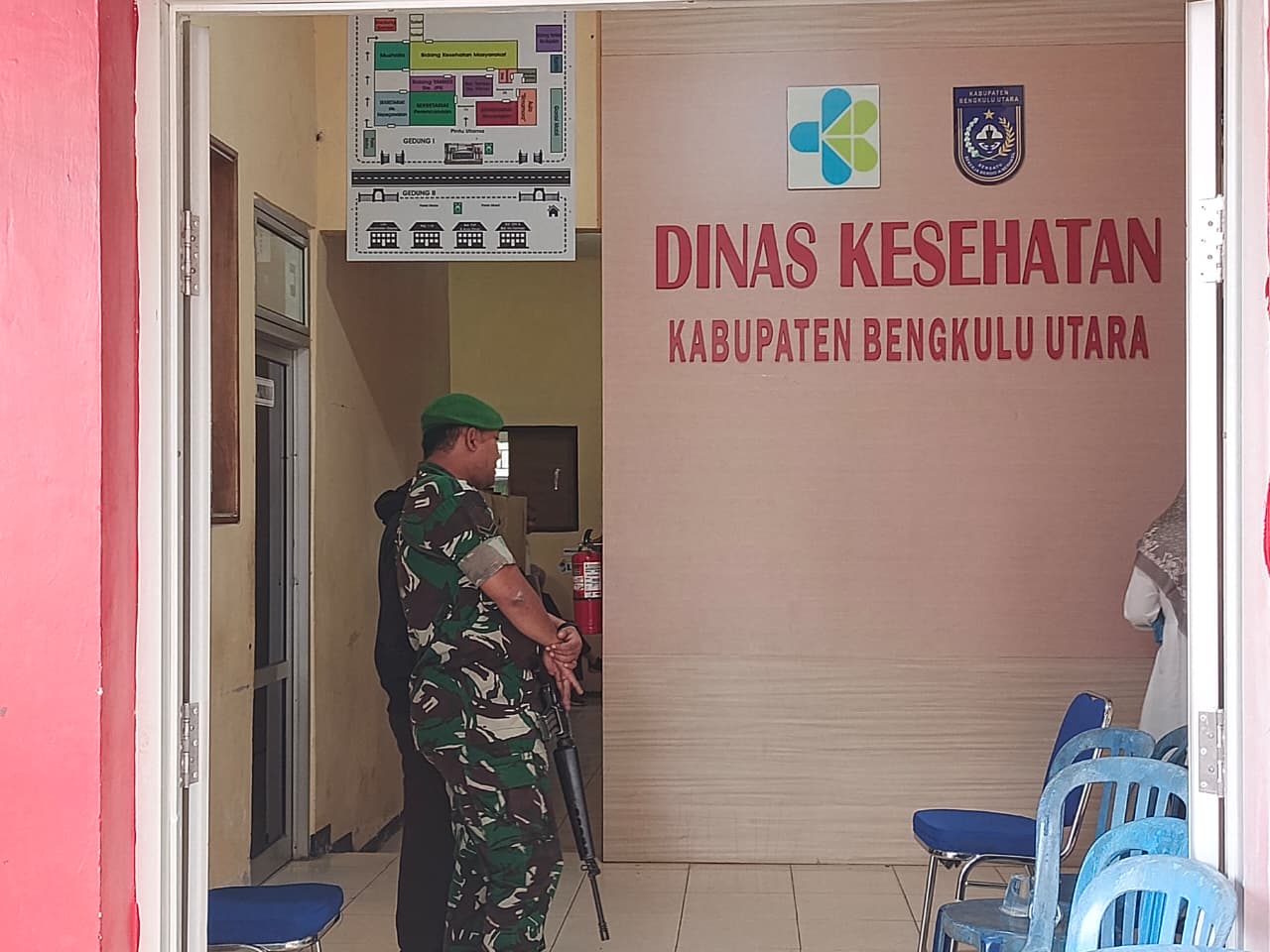 Proses penggeledahan mendapat pengamanan ketat dari sejumlah personel TNI yang berjaga di pintu masuk gedung Dinkes.