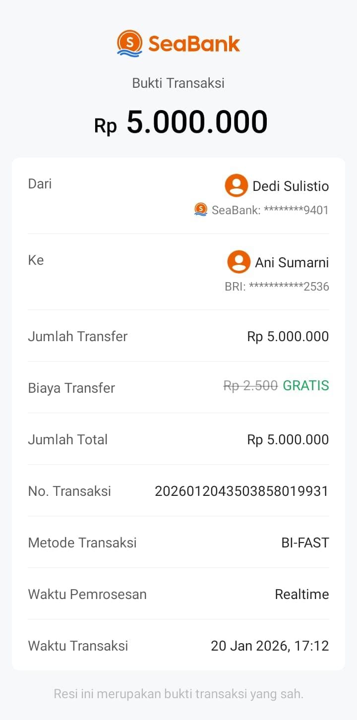 Adapun nomor rekening tujuan yang diberikan untuk ditransfer yakni BRI 445501058022536 atas nama Ani Sumarni.