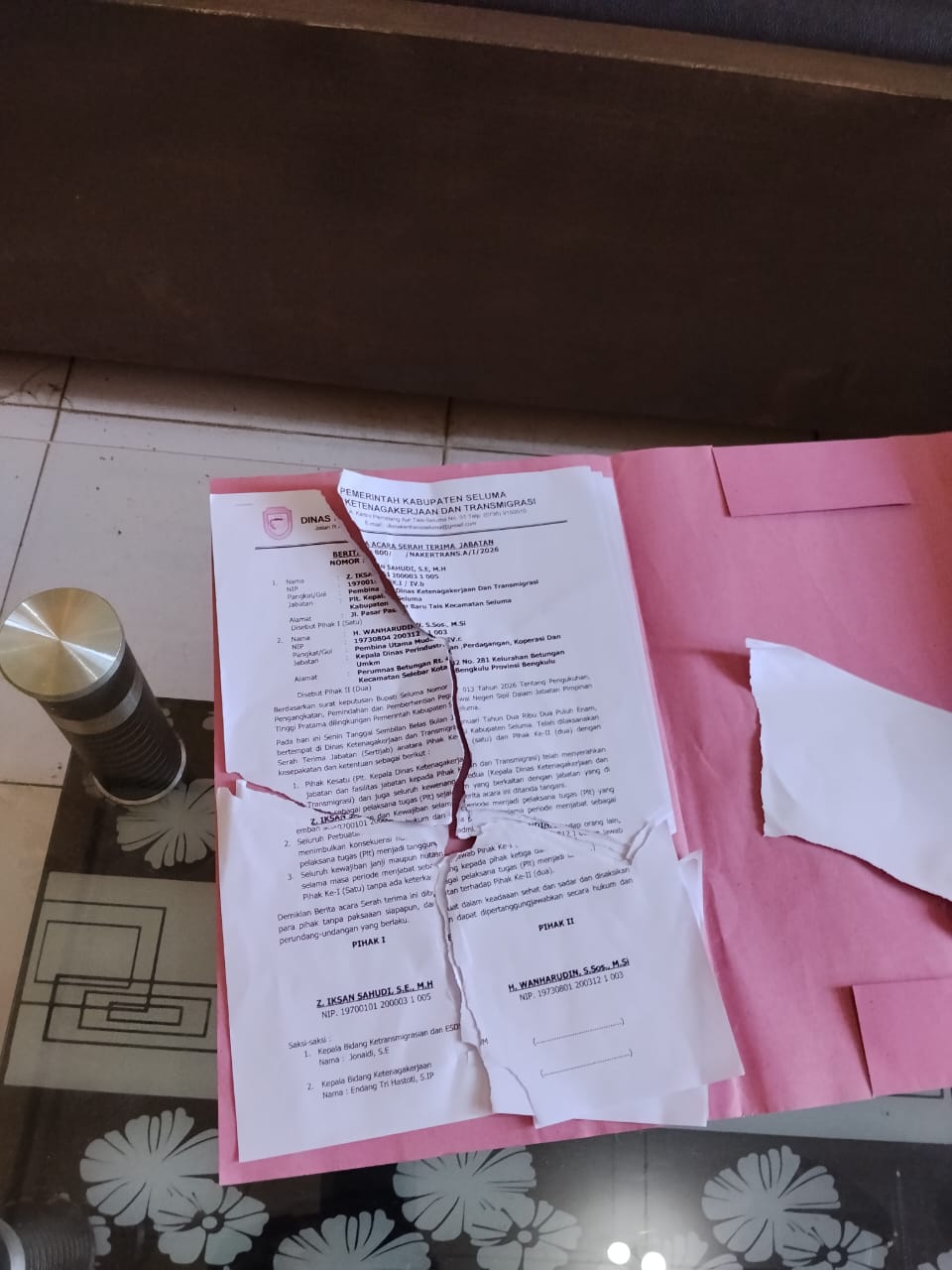 Kisruh kedua pejabat ini karena kepala Disnakertrans Seluma tidak terima surat berita acara serah terima jabatan dirobek oleh Sekretarisnya.