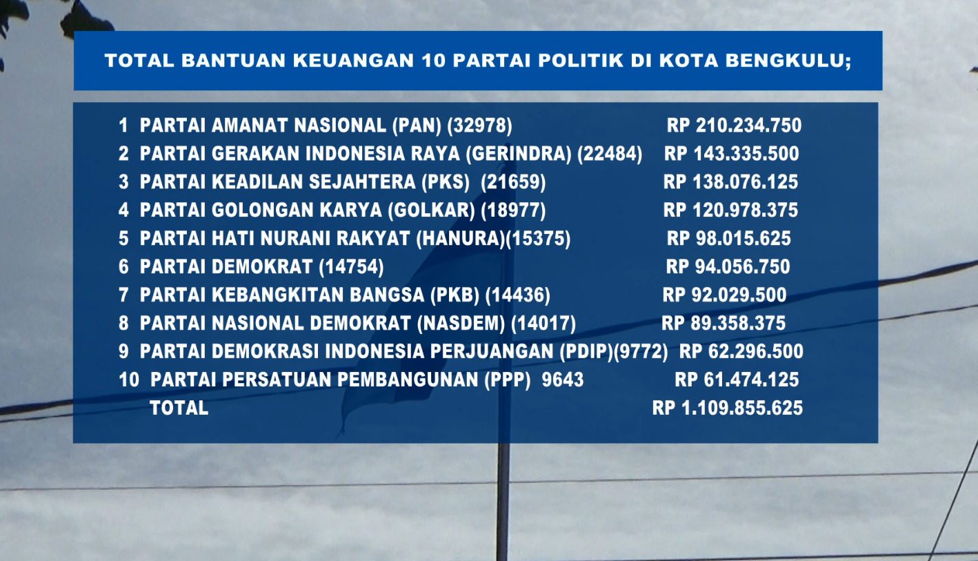 Rincian Bantuan Keuangan 10 Partai Politik di Kota Bengkulu