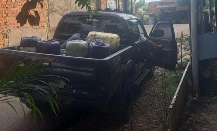 BBM subsidi itu kemudian disedot dari tangki mobil dengan menggunakan selang dan ditampung ke dalam masing-masing jeriken kapasitas 30 liter untuk dijual kembali.