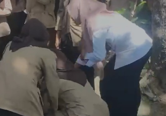Sementara itu, seorang guru wanita berbaju putih pun tampak kewalahan melerai perkelahian yang membuat korban pingsan.