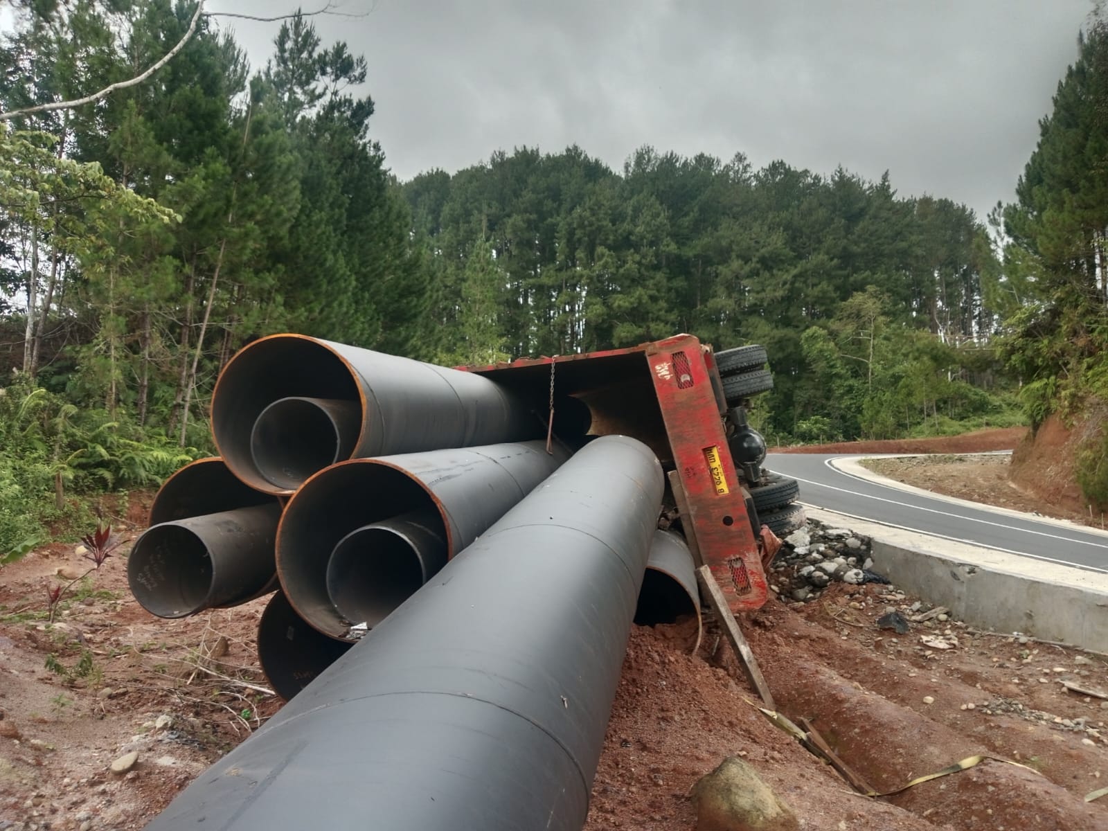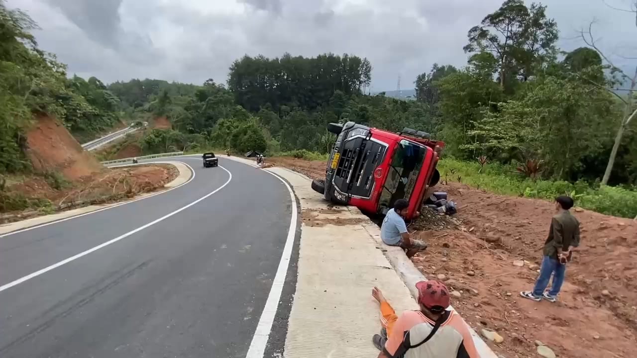 Sebuah truk bermuatan pipa besi terguling di Jalan Ring Road Kepahiang pada Jumat (6/3).