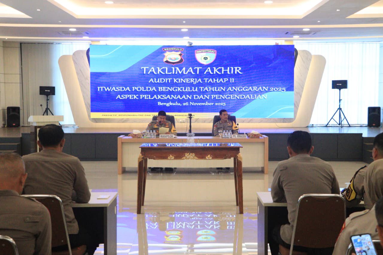 Dengan mengucapkan syukur ke hadirat Tuhan Yang Maha Esa, Wakapolda Bengkulu menyatakan bahwa Taklimat Akhir Audit Kinerja Itwasda Polda Bengkulu secara resmi dinyatakan selesai.
